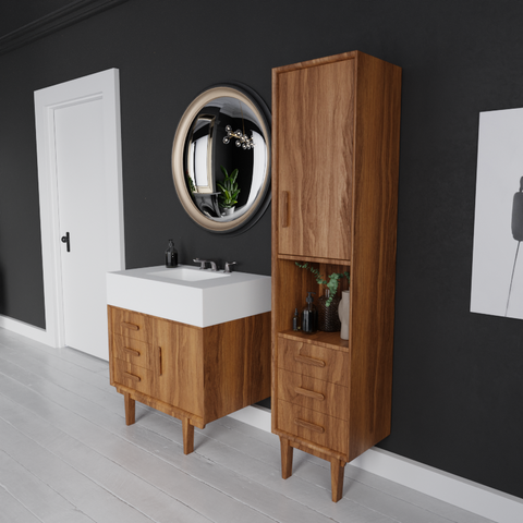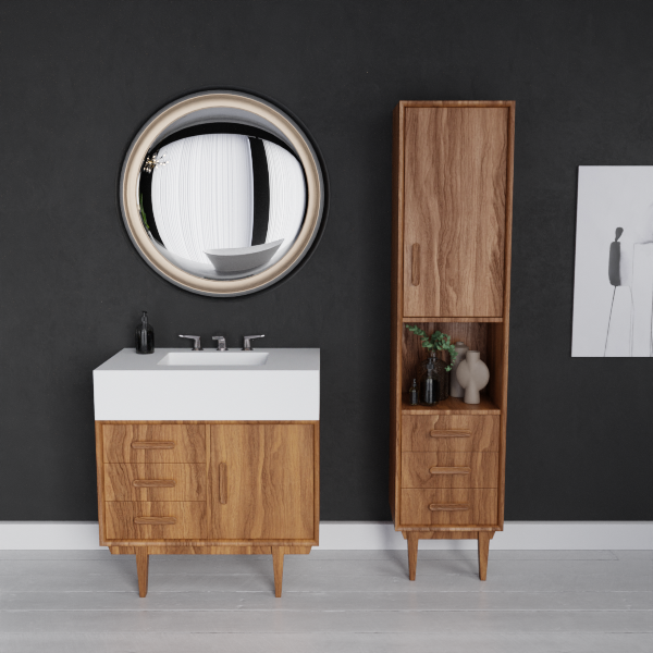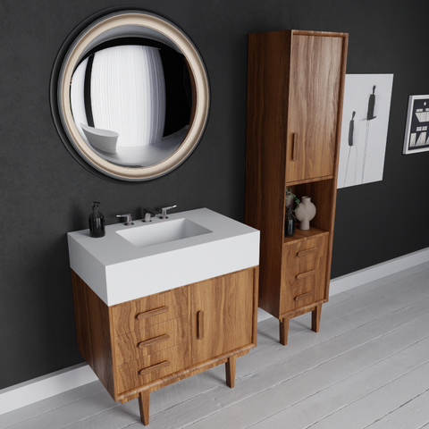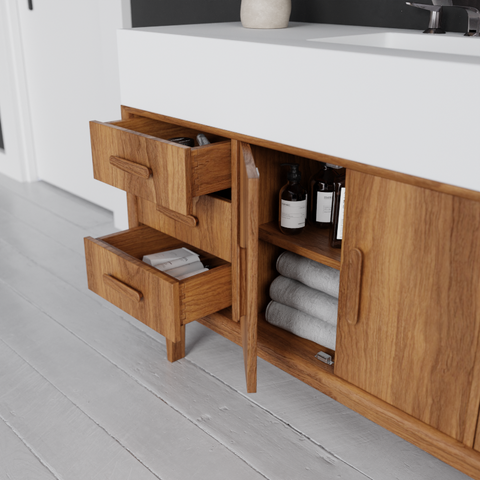 The cabinet is available in oak or walnut veneer, finished to let the natural grain speak for itself. On top sits a solid surface basin, seamless, durable and easy to maintain, with a crisp look that works naturally against the warmth of the timber.