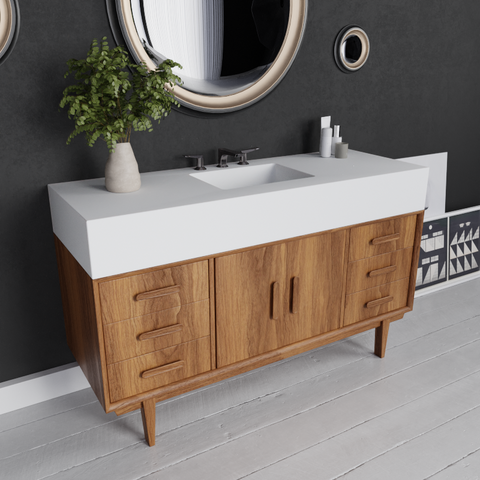 Warbler is a mid-century inspired vanity unit with a simple, furniture-led feel. Clean lines, balanced proportions and legs give it a lighter presence than a typical fitted vanity.